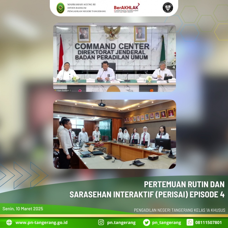 Bertempat di Ruang Rapat Pimpinan lt. 2 Gedung PN Tangerang, Ketua PN Tangerang, Fahmiron didampingi para Hakim Mentor, beserta seluruh Calon Hakim pada PN Tangerang mengikuti kegiatan Pertemuan Rutin dan Sarasehan Interaktif (PERISAI) Episode 4 yang bertema “PEMBENTUKAN CALON HAKIM: MEMPERSIAPKAN MASA DEPAN MA MEMBANGUN MA MASA DEPAN” dengan berdasarkan Surat Undangan Dirjen Badilum No. 49/DJU/UND.DL1.10/III/2025, Tanggal 04 Maret 2025 ini dimulai pada pukul 09.00 WIB s/d selesai ini dilakukan secara daring.