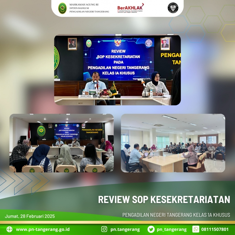 Bertempat di Ruang Aula Lt.5 Gedung PN Tangerang, Sekretaris PN Tangerang, Zulfikar Arif Rahman Purba didampingi oleh Kepala Bagian Umum Dessy Herliani memimpin Rapat Review SOP Kesekretariatan PN Tangerang. Kegiatan yang dilaksanakan pada pukul 09.00 WIB s/d Selesai ini di ikuti oleh para Kasubbag, para pelaksana dan PPNPN di kesekretariatan.