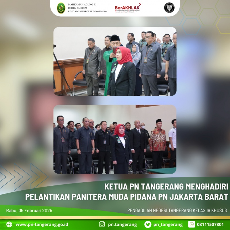 Bertempat di Ruang Sidang Utama Kusumah Atmadja, PN Jakarta Barat pada Pukul 09.00 WIB s/d Selesai, Ketua PN Tangerang, Fahmiron didampingi Para Pejabat Struktural dan para pegawai PN Tangerang menghadiri Acara Pelantikan Endang Purwaningsih pada PN Jakarta Barat sesuai dengan undangan Pelantikan dan Pengambilan Sumpah Jabatan pada Pengadilan Negeri Jakarta Barat Kelas 1A Khusus.