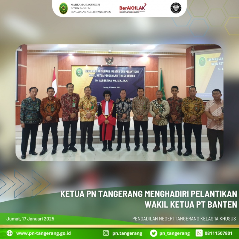 Ketua Pengadilan Negeri (PN) Tangerang, Fahmiron didampingi Sekretaris, Zulfikar Arif Rahman Purba menghadiri pelantikan Wakil Ketua Pengadilan Tinggi Banten, YM. Dr. Albertina HO, yang dilaksanakan di Pengadilan Tinggi Banten, Jumat (17/01). Acara pelantikan tersebut dihadiri oleh sejumlah pejabat penting di Lingkungan Peradilan, termasuk Para Hakim Tinggi, Pejabat Struktural, serta tamu undangan lainnya dari berbagai instansi.