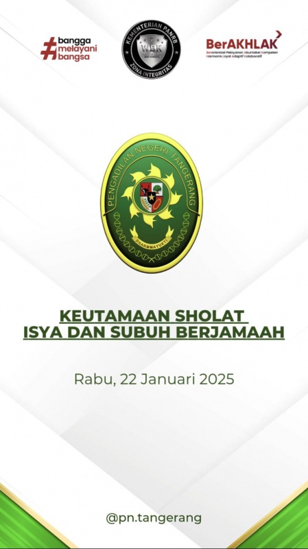 Pada hari ini, Rabu 22 Januari 2025, bertempat di Mushola Ar-Rahman PN Tangerang, Pukul 08.15, mengadakan Pengajian Rutin bagi segenap muslimin dan muslimah di lingkungan PN Tangerang. Pengajian dimulai dengan pembacaan surat Yaasin yang dipimpin oleh Zulfikar Arif Rahman Purba dan dilanjutkan dengan Tausiyah yang disampaikan oleh Masduki.
