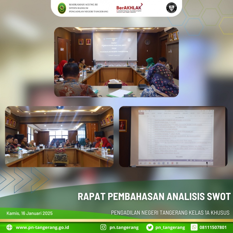 Bertempat di Ruang Rapat Pimpinan Lt. 2 Gedung PN Tangerang, Ketua PN Tangerang, Fahmiron memimpin Rapat Pembahasan Analisis SWOT sesuai dengan Surat KPN No. 157/KPN.W29.U4/UND.OT1.6/I/2025, Tanggal 10 Januari 2025 pada pukul 10.00 – 11.00 WIB ini diikuti oleh Panitera, Sekretaris, para Panitera Muda, para Kasubbag Tim Pengolah Data, dan Sekretariat.