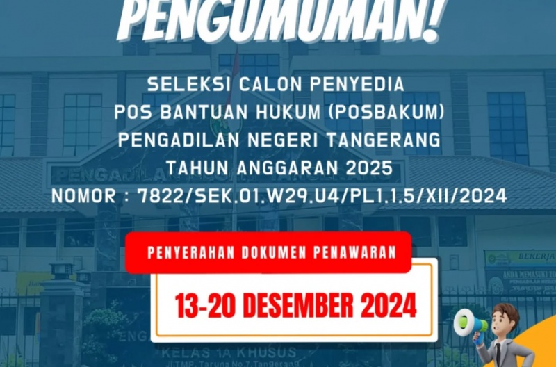 Hallo sobat hukum, kami mau memberitahu informasi bahwa berdasarkan SK Nomor: 7822/SEK.01.W29.U4/PL1.1.5/XII/2024. Kami dengan bangga mengumumkan dibukanya Seleksi Penyedia Calon POSBAKUM TA. 2025 untuk Pengadilan Negeri Tangerang! Bagi Anda yang memiliki dedikasi tinggi, berintegritas, dan memiliki passion dalam memberikan pelayanan hukum kepada masyarakat, ini adalah kesempatan emas untuk bergabung dan berkontribusi dalam sistem peradilan yang adil dan transparan.