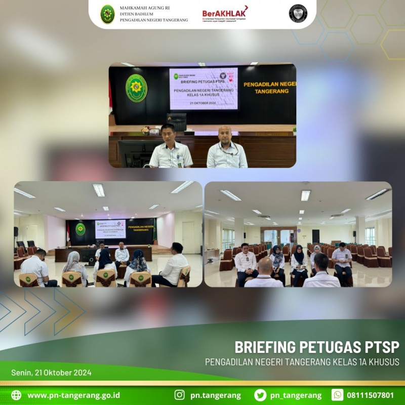 Pada hari Senin, 21 Oktober 2024, pukul 09:00 WIB, telah diadakan Briefing PTSP, diruang Aula Lantai 5, disampaikan oleh Kony Hartanto dan Achmad Irfir Rochman Hakim Pengawas Bidang PTSP, dan dihadiri oleh para Penanggung Jawab PTSP PN Tangerang.