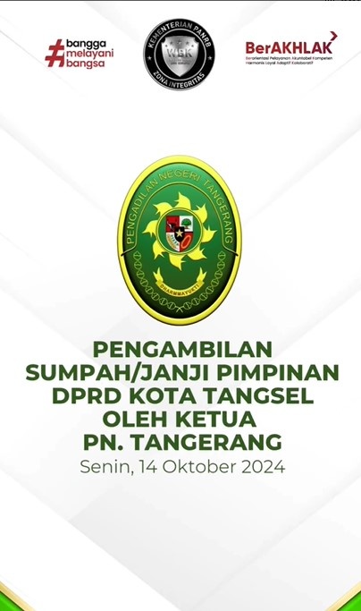 Berdasarkan Surat Undangan Nomor. 400.14.1.1/3256/Setwan/2024 perihal Permohonan Pengambilan Sumpah/Janji Pimpinan DPRD, maka pada hari ini, Dewan Perwakilan Rakyat Daerah (DPRD) Kota Tangerang Selatan menggelar Rapat Paripurna pengambilan sumpah/janji Pimpinan DPRD Kota Tangerang Selatan untuk masa jabatan 2024-2029. Fahmiron Ketua PN Tangerang Menghadiri serta melakukan pengambilan sumpah/janji pimpinan DPRD, bertempat di Gedung DPRD Kota Tangerang Selatan, pukul 10.00 WIB s.d selesai.