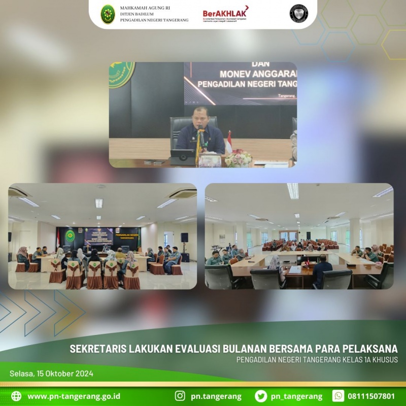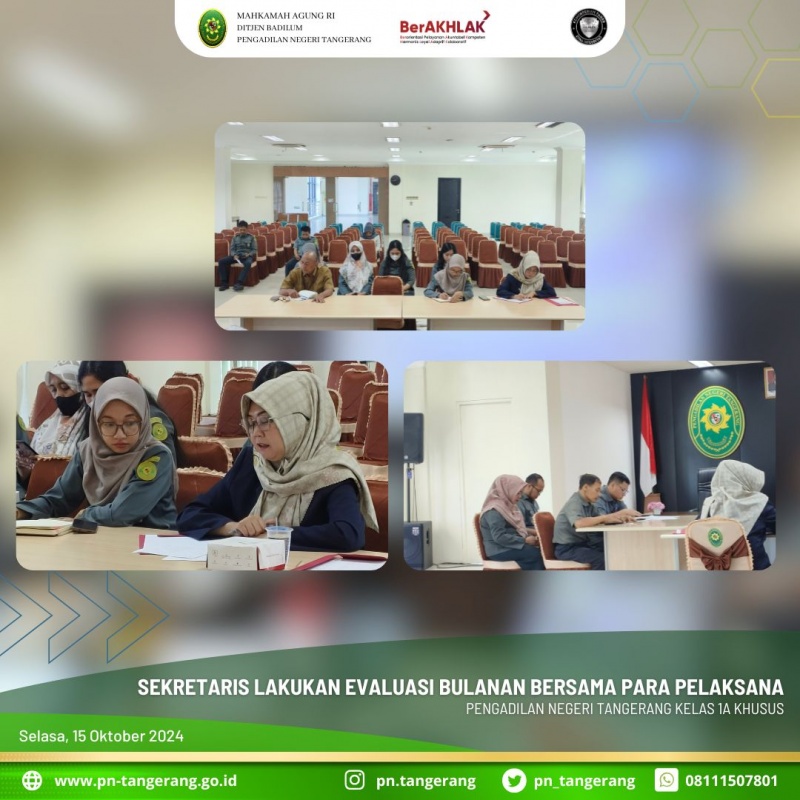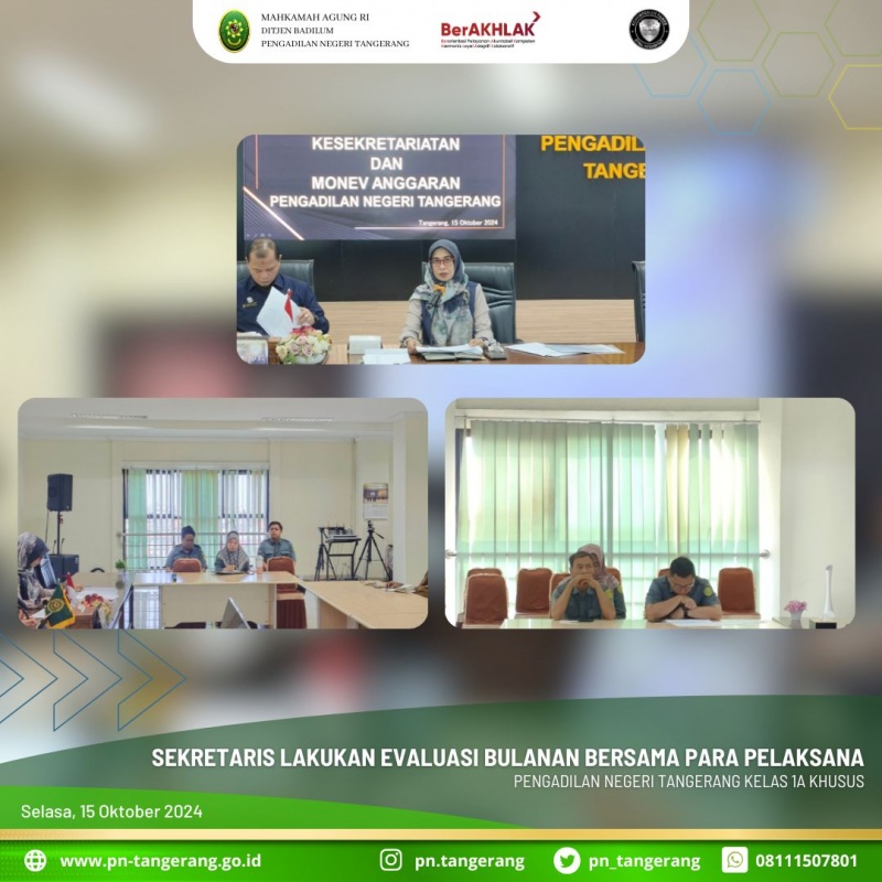 Pada pagi ini, pukul 08.30 WIB dilaksanakan Rapat Bulanan Kesekretariatan dan Monev Anggaran di ruang Aula Lt.5 Pengadilan Negeri (PN) Tangerang. Rapat tersebut dipimpin oleh Zulfikar Arif Rahman Purba dan didampingi Kabag Umum Dessy Herliani serta dihadiri oleh Para Kasubbag dan para pelaksana di Kesekretariatan.