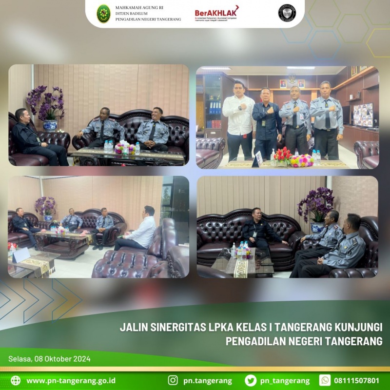 Kegiatan kunjungan ke Pengadilan Negeri Tangerang guna menjalin sinergitas antar instansi sekaligus mengenal lebih dekat. Sehingga penegakan hukum serta pemasyarakatan bisa lebih baik. Kunjungan ini merupakan langkah positif dalam memperkuat sinergi antara instansi, khususnya dalam penanganan hukum anak. berharap kerjasama ini dapat terus berlanjut dan ditingkatkan guna mendukung proses peradilan yang lebih baik dan koordinasi yang lebih erat antara Pengadilan Negeri Tangerang dan LPKA Kelas I Tangerang. (lsl).