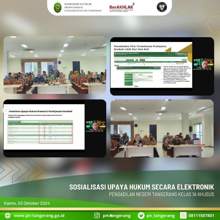 Berdasarkan surat undangan dari Direktorat Jendral Peradilan Umum (Dirjen Badilum) Nomor 6075/KPN.W29.U4/UND.DL1.10/X/224 Wakil Ketua Alfi Sahrin Usup didampingi Panitera, Sekretaris, Para Panmud serta diikuti oleh Kepaniteraan PN Tangerang mengikuti sosialisasi pembaruan aplikasi SIPP Tingkat pertama versi 5.5.0 dan aplikasi E-Court versi 6.0.0 pada Kamis (03/10) pukul 09.00 WIB di Aula Lt.5 PN Tangerang.