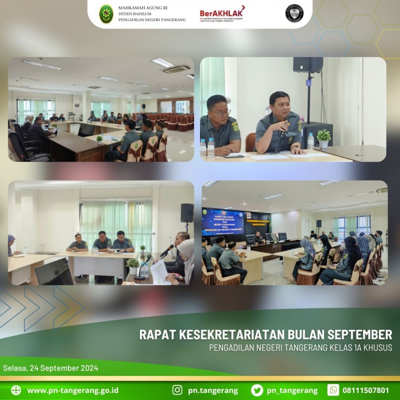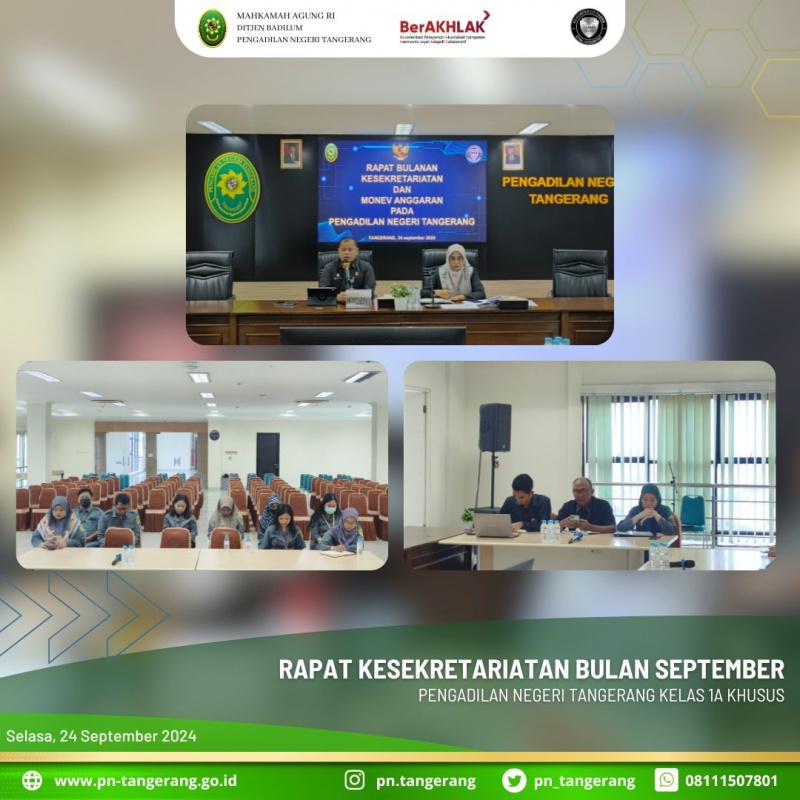 Pada pagi ini, pukul 08:30 dilaksanakan Rapat Bulanan Kesekretariatan di ruang Aula Lt.5 PN Tangerang. Rapat yang dipimpin oleh Zulfikar Sekretaris PN Tangerang, dan didampingi Dessy Kepala Bagian Umum, serta dihadiri oleh Kasubbag TUK, Kasubbag Ortala, Plt.Kasubbag PTIP, Staff, PPNPN dan Tenaga Kerja Kontrak bagian Kesekretariatan Pengadilan Negeri Tangerang