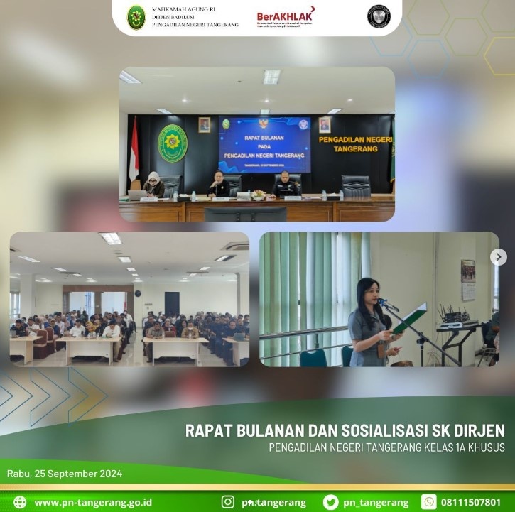 Pengadilan Negeri (PN) Tangerang mengadakan Rapat Bulanan pada hari Rabu, 25 September 2024, bertempat di Ruang Aula Lt. 5 Gedung Pengadilan Negeri Tangerang. Rapat ini dipimpin langsung oleh Fahmiron Ketua PN Tangerang, Tantri Panitera PN Tangerang, dan Zulfikar Sekretaris PN Tangerang, serta diikuti oleh seluruh Para Pejabat Struktural/Fungsional, serta diikuti oleh Karyawan/Karyawati ASN, Tenaga Honorer, dan Tenaga Kerja Kontrak pada PN Tangerang.