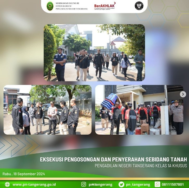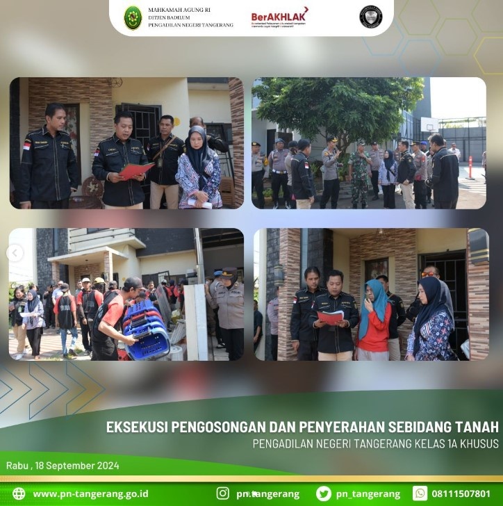 Hari ini admin mau kasih informasi ke kalian Berdasarkan Penetapan Ketua Pengadilan Negeri Tangerang Nomor : 96/PEN.EKS/2023/PN.TNGJo.Nomor. : 36/Pdt.S/2023/PN.TNG tanggal 16 September 2024, Jurusita Pengadilan Negeri Tangerang telah melakukan Eksekusi Pengosongan dan Penyerahan terhadap :