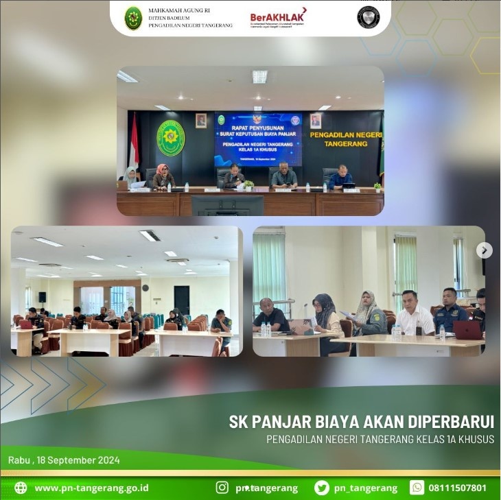 Pengadilan Negeri (PN) Tangerang mengadakan Rapat Penyusunan Surat Keputusan Biaya Panjar pada hari Rabu, 18 September 2024, bertempat di Ruang Aula Lt. 5 Gedung Pengadilan Negeri Tangerang. Rapat ini dipimpin langsung oleh Fahmiron, Ketua PN Tangerang, didampingi oleh Wakil Ketua PN Tangerang, Panitera PN Tangerang dan Sekretaris PN Tangerang, serta diikuti oleh seluruh pegawai yang terlibat dalam penyusunan Biaya Panjar pada Pengadilan Negeri Tangerang.