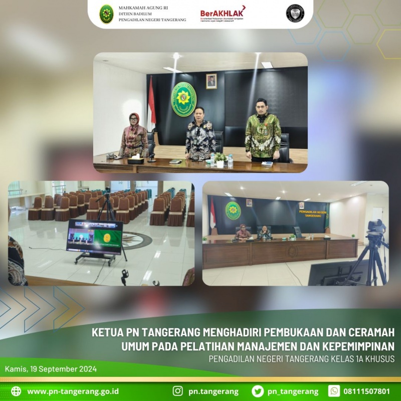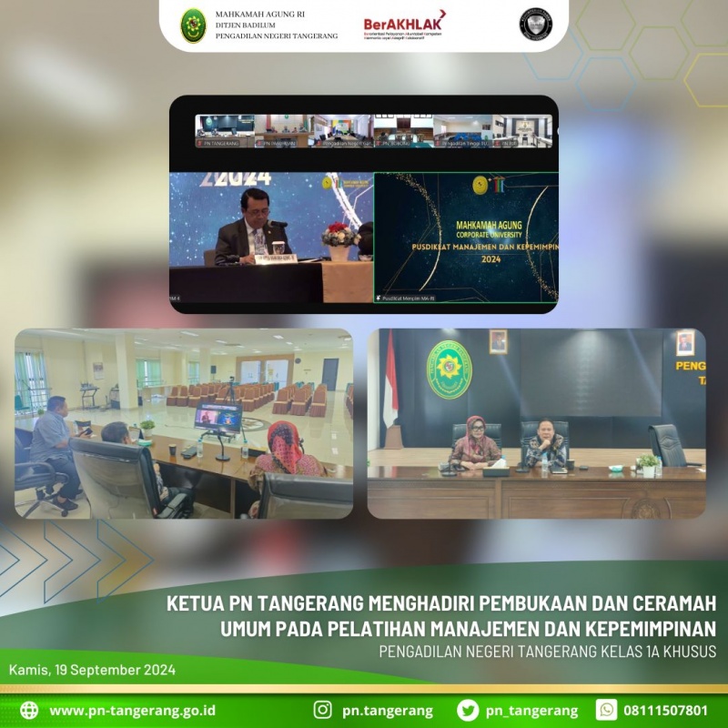 Berdasarkan Badan Strategi Kebijakan dan Pendidikan dan Pelatihan Hukum dan peradilan Mahkamah Agung RI c.q. Pusdiklat Manajemen dan Kepemimpinan menyelenggarakan Pelatihan Manajemen dan Kepemimpinan bagi Pimpinan, Panitera dan Sekretaris Pengadilan Tahun 2024. Maka pada hari ini, 19 September 2024, pukul 09.00 WIB s.d. selesai, Fahmiron Ketua PN Tangerang, didampingi oleh Tantri Yanti Panitera PN Tangerang diruang aula lantai 5, menghadiri acara Pembukaan dan Ceramah Umum tentang Kepemimpinan Pengadilan oleh Ketua Mahkamah Agung RI yang Mulia Prof. Dr. H. Muhammad Syarifuddin, S.H., M.H., secara online.