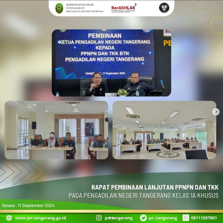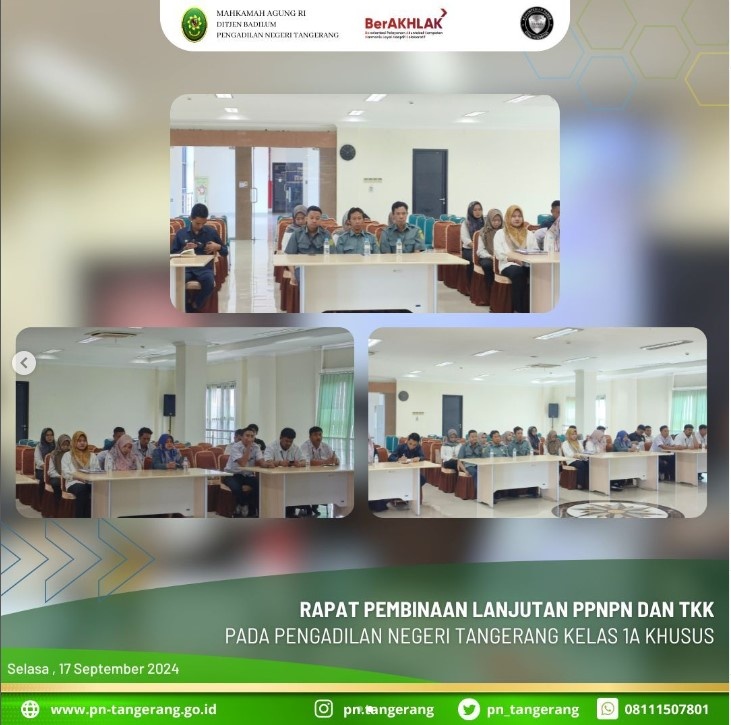 Pimpinan PN Tangerang memiliki tanggung jawab dalam meningkatkan kinerja Pemerintah untuk melayani, begitupun dengan Pegawai Pemerintah Non Pegawai Negeri (PPNPN) serta Tenaga Kerja Kontrak (TKK). Fahmiron Ketua PN Tangerang yang didampingi oleh Zulfikar Sekretaris PN Tangerang menggelar Lanjutan Pembinaan PPNPN dan TKK yang sebelumnya diadakan pada hari Jumat, 13 September 2024. Rapat diikuti oleh para PPNPN dan TKK, Kabag Umum, dan para Kasubbag PN Tangerang.