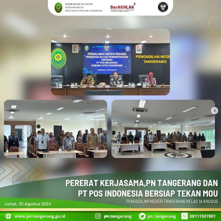 Pengadilan Negeri (PN) Tangerang mengadakan Rapat Pendalaman Materi Redaksi Pemanggilan dan Pemberitahuan bersama PT. Pos Indonesia pada hari Jumat, 30 Agustus 2024, bertempat di Ruang Aula Lt. 5 Gedung Pengadilan Negeri Tangerang. Rapat ini dipimpin langsung oleh Ketua PN Tangerang Fahmiron, didampingi oleh Wakil Ketua PN Tangerang dan Panitera , serta diikuti oleh para Hakim, para Panitera Pengganti, para Jurusita/Jurusita Pengganti, serta para pelaksana Kepaniteraan Pengadilan Negeri Tangerang.