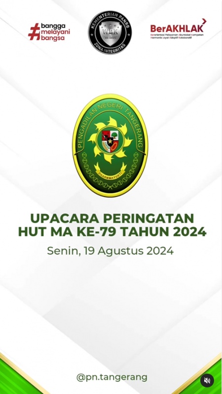 Upacara peringatan HUT Mahkamah Agung Ke-79 Tahun 2024 dilaksanakan pada pada Senin, 19 Agustus 2024, pukul; 08.00 WIB, di halaman Parkir PN Tangerang. Bertindak sebagai Pembina Upacara adalah Ketua Pengadilan Negeri Tangerang, Fahmiron.