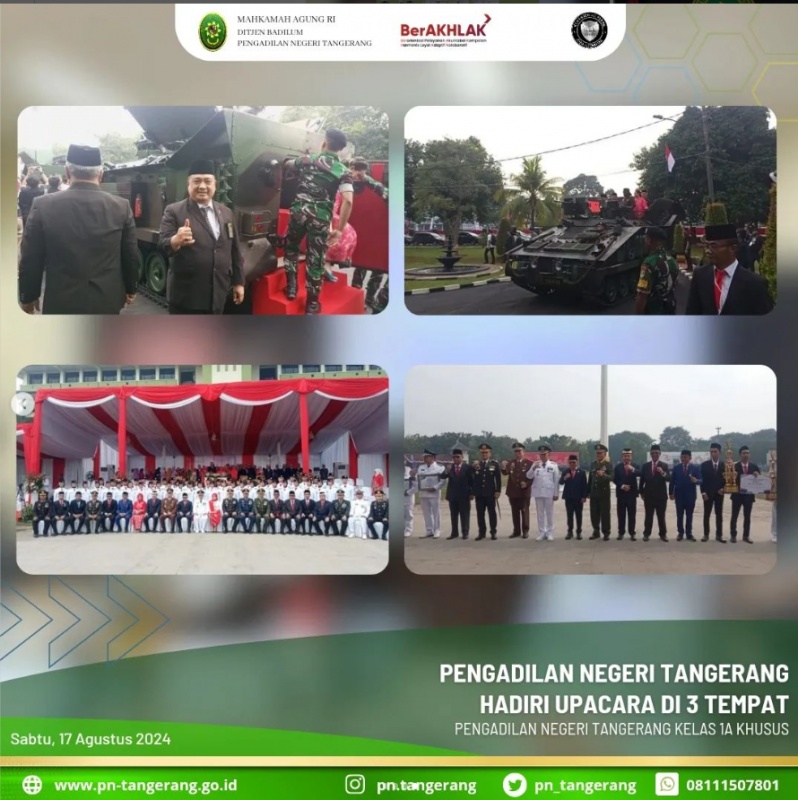 Bertempat di Alun-alun Ahmad Yani, Ketua Pengadilan Negeri Tangerang Kelas 1A Khusus Bapak Fahmiron, menghadiri dan mengikuti rangkaian kegiatan Upacara Bendera Merah Putih Hari Ulang Tahun (HUT) Proklamasi Kemerdekaan Republik Indonesia ke-79 Tahun 2024 Kota Tangerang.