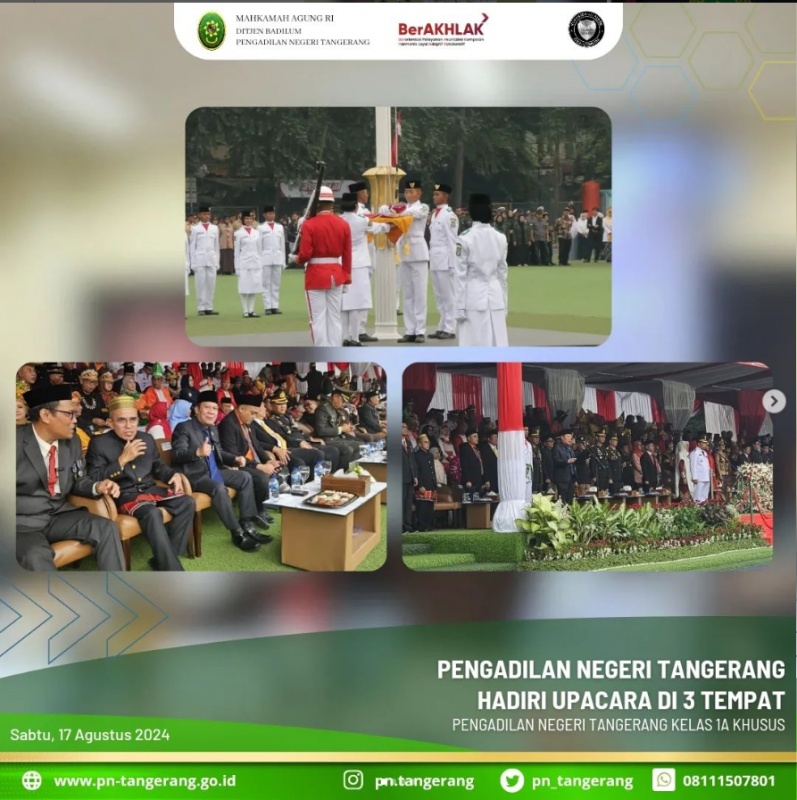 Upacara dimulai pada hari Sabtu, 17 Agustus 2024, pukul 07.00 WIB tersebut dipimpin oleh Pj.Walikota Tangerang sebagai Pembina Upacara. Pada kesempatan hari ini Ketua Pengadilan Negeri Tangerang diamanatkan menjadi Pembaca Naskah UUD 1945.