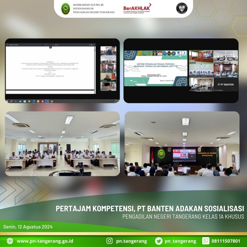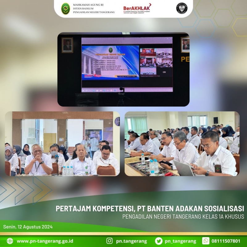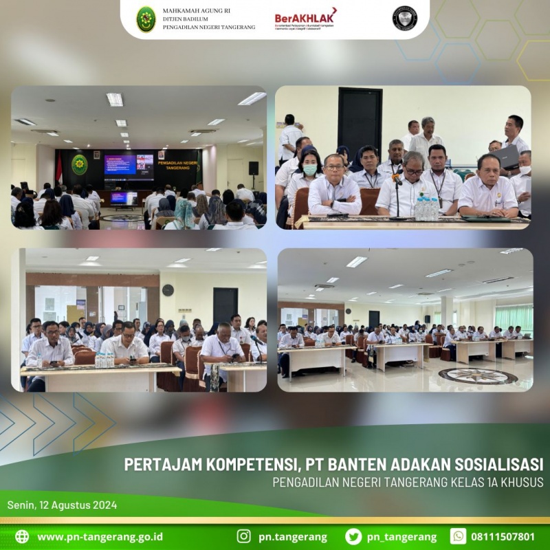 Pagi ini bertempat di Aula Lt.5 Pengadilan Negeri (PN) Tangerang. Seluruh Hakim, Pejabat Struktural dan Pelaksana Kepaniteraan PN Tangerang mengikuti sosialisasi yang diadakan oleh Pengadilan Tinggi Banten. Sosialisasi ini dibuka oleh Ketua Pengadilan Tinggi Banten, Ibu Andriani Nurdin. Adapun Materi sosialisasi yang disampaikan adalah sebagai berikut :