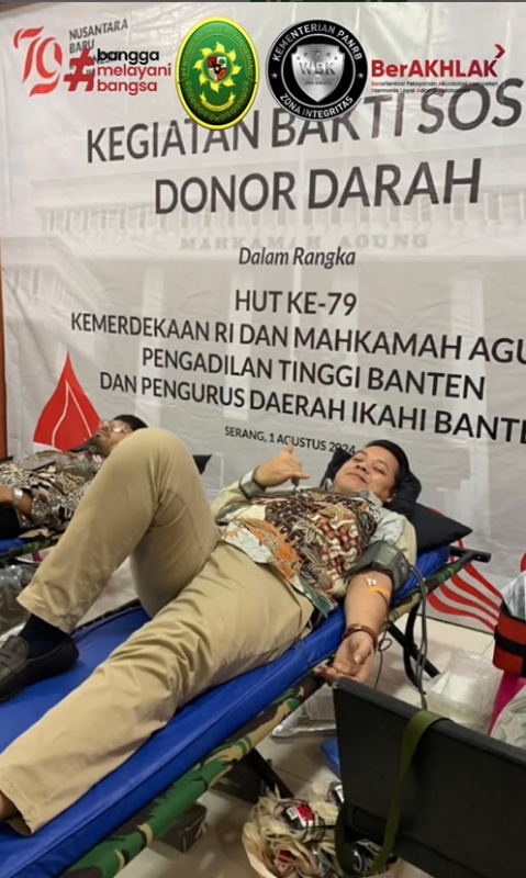 Pengadilan Tinggi Banten menggelar aksi Donor Darah dalam rangka HUT Kemerdekaan RI dan Mahkamah Agung RI ke-79, pada Kamis, 01 Agustus 2024, pukul 08.00 WIB. Kegiatan ini mengundang seluruh Pengadilan Negeri Se-wilayah Banten.