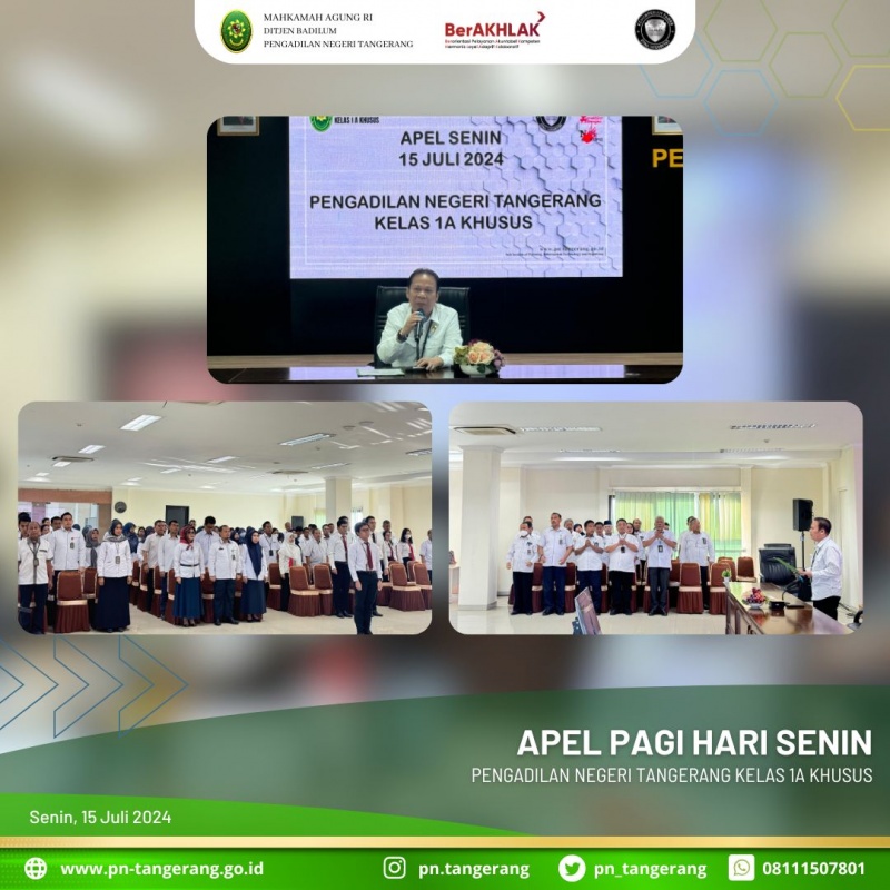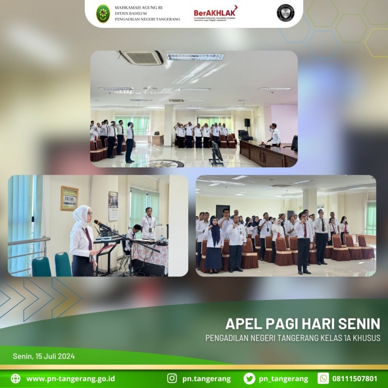 Apel rutin Senin pagi pukul 08.00 WIB bertempat di ruang Aula Lt.5 Pengadilan Negeri Tangerang. Yang dipimpin oleh Ketua Pengadilan Negeri Tangerang Bapak Dr. Fahmiron, S.H.,M.Hum selaku Pembina Apel yang diikuti oleh Bapak/Ibu Hakim, Panitera, Sekretaris, Para Pejabat Struktural/Fungsional, serta diikuti oleh Karyawan/Karyawati ASN, Tenaga Honorer, dan Tenaga Kerja Kontrak pada Pengadilan Negeri iconwin Tangerang