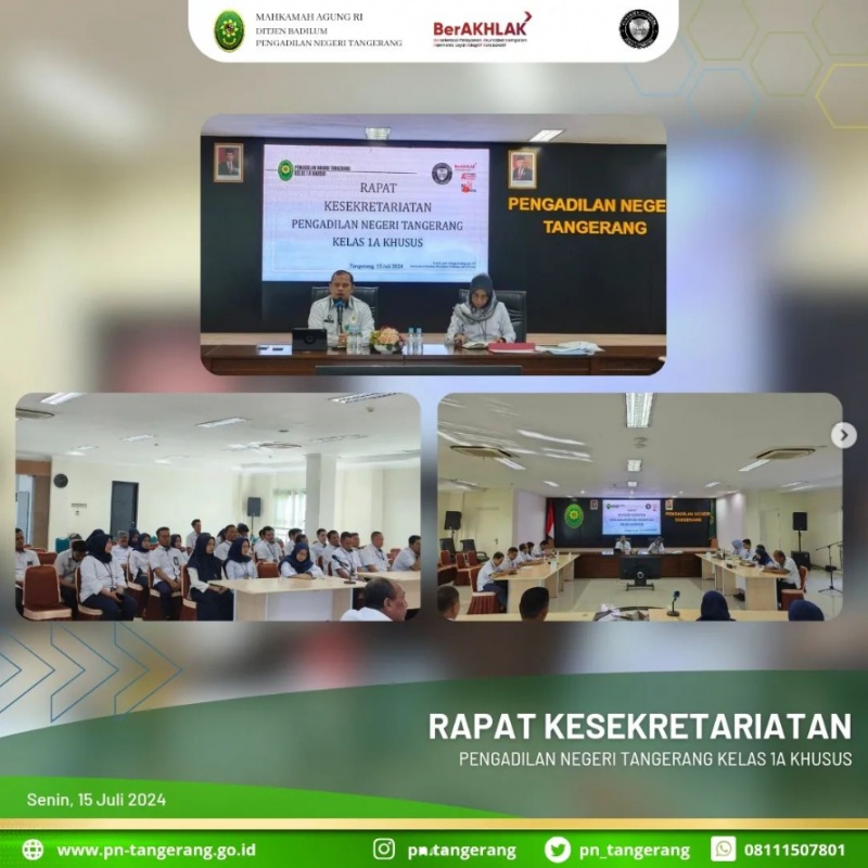 Pada pagi ini, pukul 08:30 dilaksanakan Rapat Kesekretariatan di ruang Aula Lt.5 PN Tangerang. Rapat yang dipimpin oleh Sekretaris Pengadilan Negeri Tangerang, Bapak H. Zulfikar Arif Rahman Purba, S.H., M.M., dan didampingi Kepala Bagian Umum Ibu Dessy Herliani, S.Sos. Dihadiri oleh Kasubag TUK, Kasubag Ortala, Plt.Kasubag PTIP, Staff Kesekretariatan, PPNPN dan Tenaga Kerja Kontrak Pada Pengadilan Negeri Tangerang