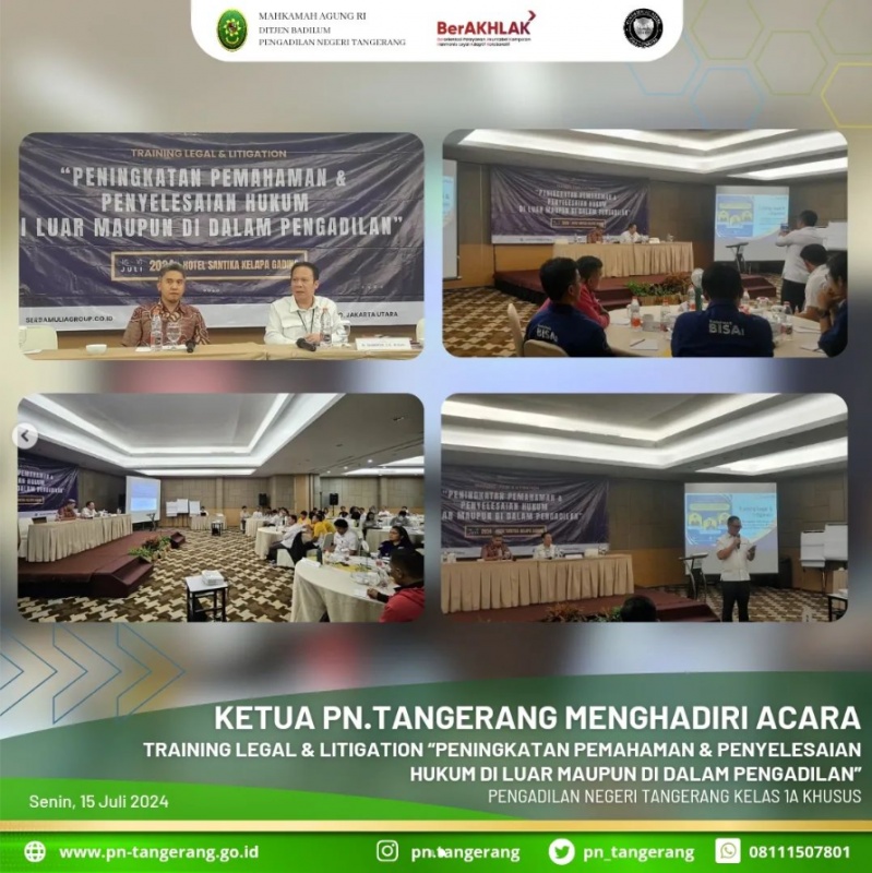Berdasarkan Surat Undangan Nomor. 009/SMG-Legal Litigasi/VII/2024 Perihal Surat Undangan Sebagai Pembicara dari Serba Mulia Group yang mengadakan pelatihan bagi Team Legal & Litigasi yang bertema “Peningkatan Pemahaman & Penyelesaian Hukum di Luar maupun di Dalam Pengadilan”. Ketua PN. iconwin Tangerang Dr. Fahmiron, S.H., M.H., menghadiri acara tersebut sebagai Pembicara, pada Hari ini Senin, 15 Juli 2024, pukul 10.00 WIB – selesai, bertempat di Hotel Santika Kelapa Gading. Acara ini berlangsung dalam bentuk forum diskusi interaktif dan bertujuan untuk membuat suatu strategi dalam penanganan permasalahan hukum di Serba Mulia Group.