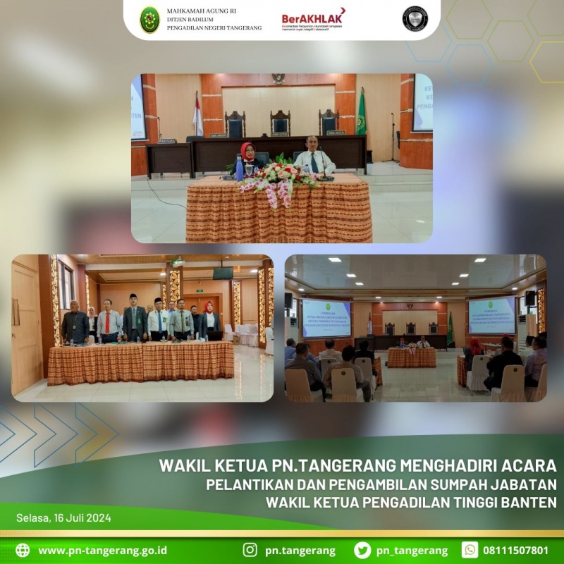 menghadiri acara Pelantikan dan pengambilan Sumpah Jabatan Wakil Ketua Pengadilan Tinggi Banten, didampingi Panitera Muda Perdata dan Kepala Bagian Umum PN Tangerang, acara ini dimulai pukul 10.00 WIB s.d. selesai, bertempat di PT Banten. Ketua Pengadilan Tinggi Banten Ibu Dr. Andriani Nurdin, S.H., M.H., secara langsung melantik Wakil Ketua Pengadilan Tinggi Banten Bapak Aroziduhu Waruwu, S.H., M.H., Dengan dilantiknya sebagai Wakil Ketua Tinggi Banten di Pengadilan Tinggi Banten, harapannya akan membantu membawa Pengadilan Tinggi Banten serta PN Tangerang, Rangkasbitung, Pandeglang dan Serang kearah yang lebih maju.