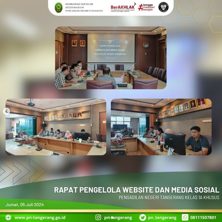Pada pagi ini, pukul 09:00 dilaksanakan Rapat Pengelola Website dan Media Sosial di Ruang Rapat Pimpinan lantai 2 Pengadilan Negeri Tangerang. Rapat yang dipimpin oleh Sekretaris Pengadilan Negeri Tangerang, Bapak H. Zulfikar Arif Rahman Purba, S.H., M.M., dan dihadiri oleh Para Kepala Subbagian, Tim pengelola Website dan Media Sosial pada Pengadilan Negeri Tangerang.