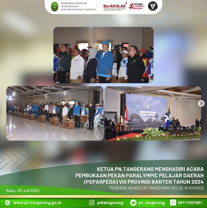 Berdasarkan surat undangan dari Gubernur Banten pada Hari Selasa, 02 Juli 2024, Ketua PN Tangerang Dr. Fahmiron, S.H., M.Hum., Menghadiri acara pembukaan Pekan Paralympic Pelajar Daerah (PEPARPEDA) VIII Provinsi Banten Tahun 2024, bertempat di Tangerang Convention Center, pukul 09.30 WIB.