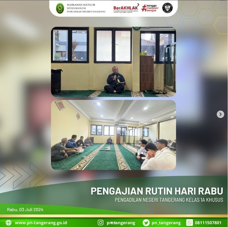Pada hari Rabu, 03 Juli 2024 bertempat di Mushola Ar-Rahman PN Tangerang, Pukul 08.15, diadakan Pengajian Rutin bagi segenap muslimin dan muslimah di lingkungan PN Tangerang. Pembacaan Surat Yaasin dipimpin oleh Bapak H. Zulfikar Arif Rahman Purba, S.H., M.M. dan tausiyah disampaikan oleh Bapak H. Masduki, S.H. Kegiatan tersebut dihadiri oleh Pejabat Struktural/Fungsional, Staff ASN Pengadilan Negeri Tangerang.