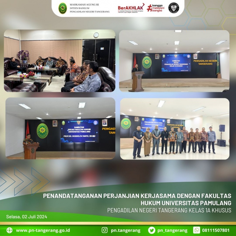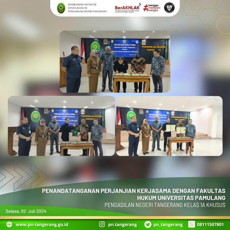 Berdasarkan Undangan No 3857/KPN.W29.U4/HM2.1.4/VII/2024 tanggal 1 Juli 2024, maka dilakukan Penandatanganan Perjanjian Kerja Sama antara Pengadilan Negeri Tangerang dengan Fakultas Hukum Universitas Pamulang yang berlangsung pada Selasa, 02 Juli 2024 Pukul 09.00 WIB di Aula Lt.5 PN Tangerang. Ketua PN Tangerang Dr. Fahmiron, S.H., M.Hum. dan Dekan Fakultas Hukum Universitas Pamulang Prof. Dr. Oksidelfa Yanto, S.H., M.H. melakukan penandatanganan perjanjian kerjasama tersebut.