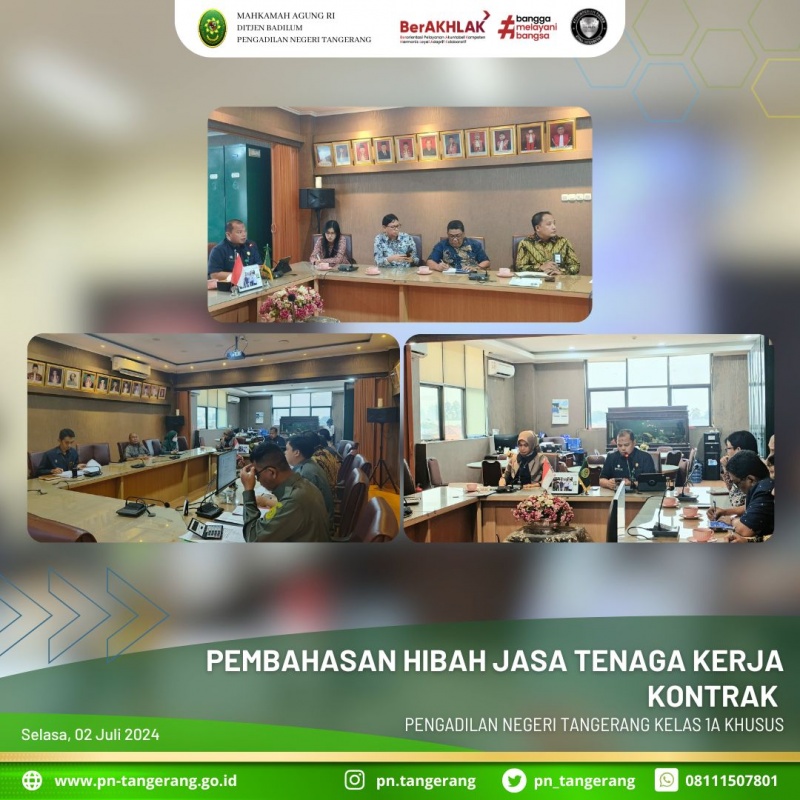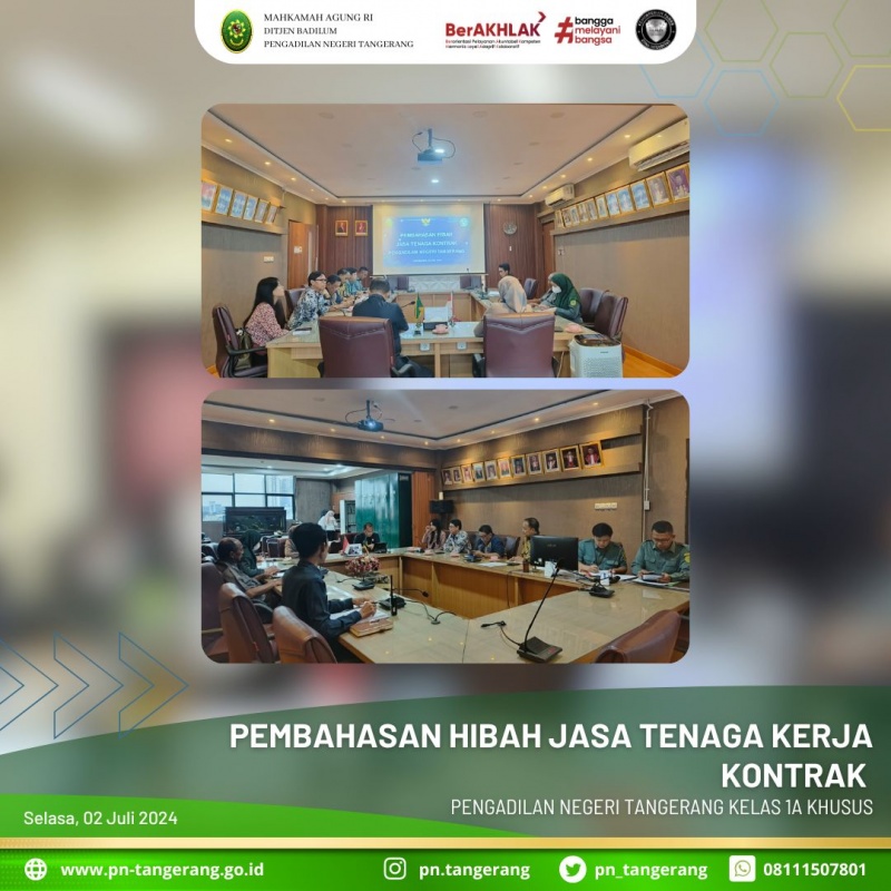 Sehubungan dengan terbitnya SK Sekretaris Mahkamah Agung RI No.3286/SEK/PL1.2.4/VI/2024 tanggal 25 Juni 2024 perihal persetujuan Hibah Jasa pada Pengadilan Negeri Tangerang. maka diadakan pertemuan antara pemberi Tenaga Kerja Kontrak PT. Binayasa Karya Pratama (PT. BKP) yang diwakili oleh Bapak A. Noorahman Kadiv HR Outsorcing Business, Bapak Hanafi DBM Business BTN KC Tangerang, Bapak Agung Setyadi Area Service Manager Tangerang Raya dan Ibu Meilani Suryani Staff Branch Funding Sales dengan Sekretaris Pengadilan Negeri Tangerang, Bapak H. Zulfikar Arif Rahman Purba, S.H., M.M., didampingi Kepala Bagian Umum Ibu Dessy Herliani, S.Sos, Kasubag TUK Bayu F.L Bhaskara, S.T., M.H, Kasubag Kepegawaian Ortala H. Rachmat Budiyanto, PLT. Kasubag PTIP Diniarti Mayaciptani, S.E., M.M. di ruang Rapat Pimpinan Lt.2 PN Tangerang.