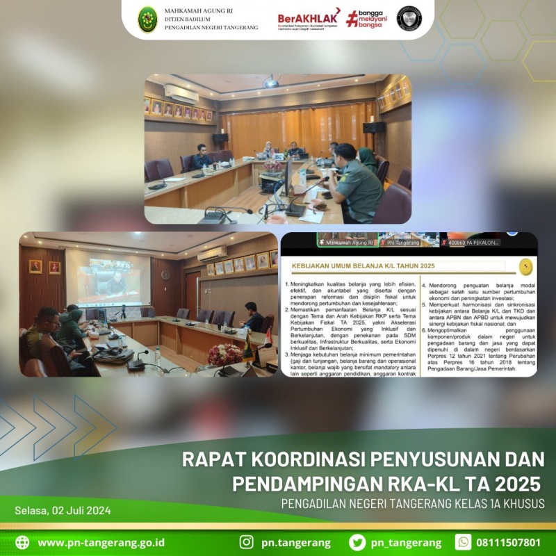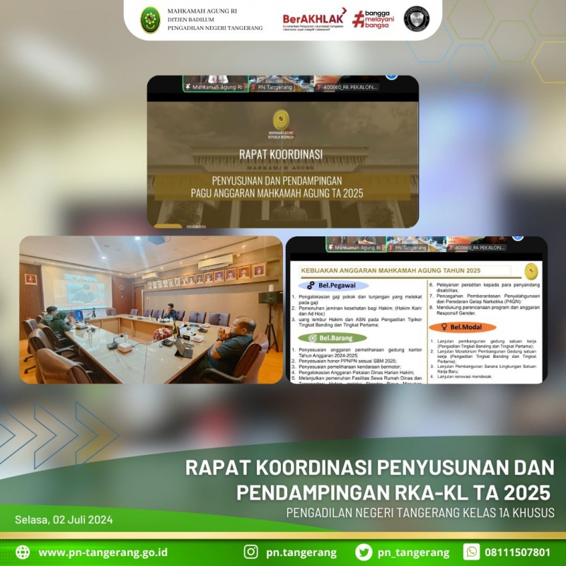 Berdasarkan surat undangan dari Mahkamah Agung Republik Indonsia Nomor 212/BUA.1/UND.RA1.7/VI/2024 tanggal 28 Juni 2024 mengenai Undangan Rapat Koordinasi Kebijakan dan Penganggaran MA Tahun Anggaran 2025 Pada Pengadilan Tingkat Banding dan Tingkat Pertama Pada 4 (Empat) Lingkungan Peradilan Dibawahnya, maka Sekretaris Pengadilan Negeri Tangerang, Bapak H. Zulfikar Arif Rahman Purba, S.H., M.M., didampingi Kepala Bagian Umum Ibu Dessy Herliani, S.Sos, Kasubag TUK Bayu F.L Bhaskara, S.T., M.H, PLT. Kasubag PTIP dan operator RKA-KL Pengadilan Negeri iconwin Tangerang mengikuti kegiatan tersebut.