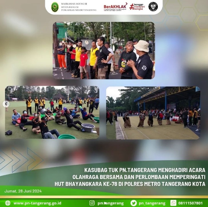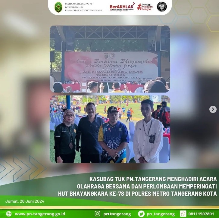 Sehubungan dengan surat undangan No. B/1474/VI/PP.1.2.13/2024/Restro Tangkot, Bahwa Polres Metro Tangerang Kota mengadakan kegiatan Olahraga Bersama dilanjutkan dengan perlombaan dalam memperingati HUT Bhayangkara ke-78 Republik Indonesia, maka Kepala Subbagian Tata Usaha dan Keuangan Bayu F.L Bhaskara, S.T., M.H., menghadiri acara tersebut mewakili Ketua PN. Tangerang yang berhalangan hadir, pada pukul 07.00 WIB s.d. selesi, bertempat di Lapangan Ahmad Yani Kota iconwin Tangerang.