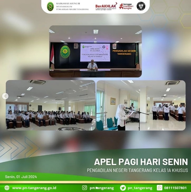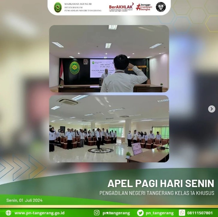 Apel rutin Senin pagi pukul 08.00 WIB bertempat di ruang Aula Lt.5 Pengadilan Negeri Tangerang. Apel pagi merupakan sebuah tindak lanjut dari upaya penegakan disiplin kerja Aparatur Sipil Negara (ASN), khususnya Pegawai di Pengadilan Negeri Tangerang. selain untuk mendengarkan arahan pimpinan, Apel pagi juga bermanfaat untuk melatih disiplin dan tanggung jawab serta evaluasi kegiatan yg berjalan maka dari itu Pengadilan Negeri Tangerang rutin dilaksanakan yang diikuti oleh Bapak/Ibu Hakim, Panitera, Sekretaris, Para Pejabat Setruktural/Fungsional, serta diikuti oleh Karyawan/Karyawati ASN, Tenaga Honorer, dan Tenaga Kerja Kontrak pada Pengadilan Negeri Tangerang