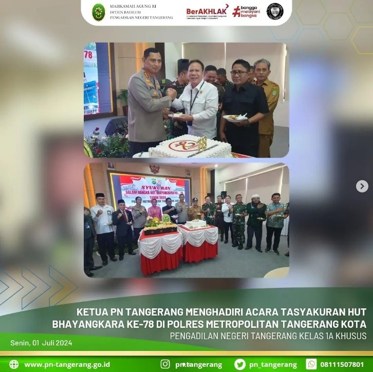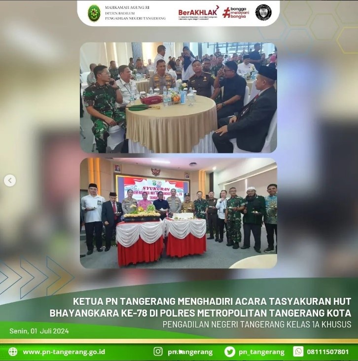 Berdasarkan surat undangan dari Polres Metropolitan Tangerang Kota acara syukuran dalam rangka Hari Bhayangkara Ke-78 Tahun 2024, maka Ketua PN Tangerang Bapak Dr. Fahmiron, S.H.,M.Hum. menghadiri acara tersebut yang bertempat di Aula Lt.2 Polres Metropolitan Tangerang Kota, setelah seluruh rangkaian acara selesai ditutup dengan sesi foto bersama