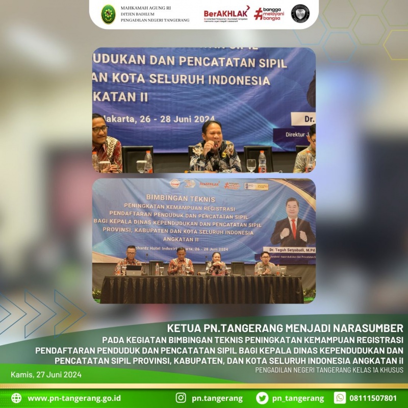 Maka pada hari ini, pukul 13:30, Ketua PN Tangerang Dr. Fahmiron, S.H., M.Hum., hadir dalam acara tersebut sebagai narasumber dalam kegiatan Bimbingan Teknis Peningkatan Kemampuan Registrasi Pendaftaran Penduduk dan Pencatatan Sipil bagi Kepala Dinas / Unit Kerja yang Membidangi Kependudukan dan Pencatatan Sipil Provinsi dan Kepala Dinas Kependudukan dan Pencatatan Sipil Kabupaten/Kota serta Kepala Bidang Pendaftaran Penduduk dan Kepala Bidang Pencatatan Sipil Provinsi dan Kabpuaten/Kota dengan tema materi "Kebijakan Perencanaan, Penganggaran dan Peraturan Perundang-Undangan Bidang Kependudukan Dan Pencatatan Sipil", yang bertempat di Orchardz Hotel Industri Kota Jakarta Pusat.
