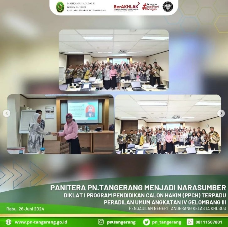 Pada hari Rabu, 26 Juni 2024, bertempat di Pusdiklat Mahkamah Agung RI Jalan Cikopo Selatan, Desa Sukamaju, Kec. Megamendung, Bogor – Jawa Barat, Panitera Iconwin Pengadilan Negeri Tangerang Kelas 1A Khusus Ibu Dr. Hj. Tantri Yanti Muhammad, S.H., M.H., C.LA., hadir sebagai narasumber Diklat I Program Pendidikan Calon Hakim (PPCH) Terpadu Peradilan Umum Angkatan IV Gelombang 3.