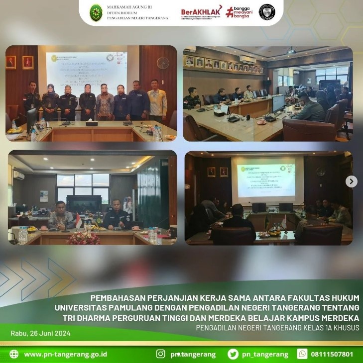 Pada Hari ini, 26 Juni 2024, pukul 13.00, bertempat di Ruang Rapat Pimpinan Lantai 2 Pengadilan Negeri Tangerang melaksanakan Kegiatan Pembahasan Perjanjian Kerja Sama Antara Fakultas Hukum Universitas Pamulang Dengan Pengadilan Iconwin Negeri Tangerang Tentang Tri Dharma Perguruan Tinggi dan Merdeka Belajar Kampus Merdeka. Yang dihadiri oleh Ketua PN Tangerang Dr. Fahmiron, S.H., M.H., Sekretaris H. Zulfikar Arif Rahman Purba, S.H., M.M., Kepala Bagian Umum Dessy Herliani, S.Sos., Kasubag TUK, Ortala, dan PLT Kasubag PTIP, serta Dekan Fakultas Hukum Universitas Pamulang beserta jajarannya.