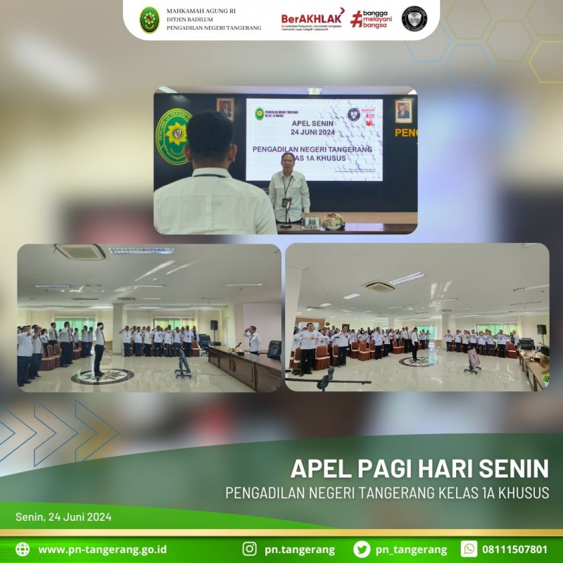 Apel Senin pagi merupakan sebuah tindak lanjut dari upaya penegakan disiplin kerja Aparatur Sipil Negara (ASN), khususnya pegawai di Pengadilan Negeri Iconwin Tangerang. Selain untuk mendengarkan arahan pimpinan, apel pagi juga bermanfaat untuk melatih disiplin dan tanggung jawab serta evaluasi kegiatan yang berjalan. Maka dari itu Pengadilan Negeri Tangerang melaksanakan apel pagi hari Senin, 24 Juni 2024, di ruang aula lantai 5, diikuti oleh Bapak/Ibu Hakim, Sekretaris, para pejabat Struktural/Fungsional, serta diikuti oleh seluruh Karyawan/Karyawati ASN, Tenaga Honor dan Tenaga Kerja Kontrak pada Pengadilan Negeri Tangerang.