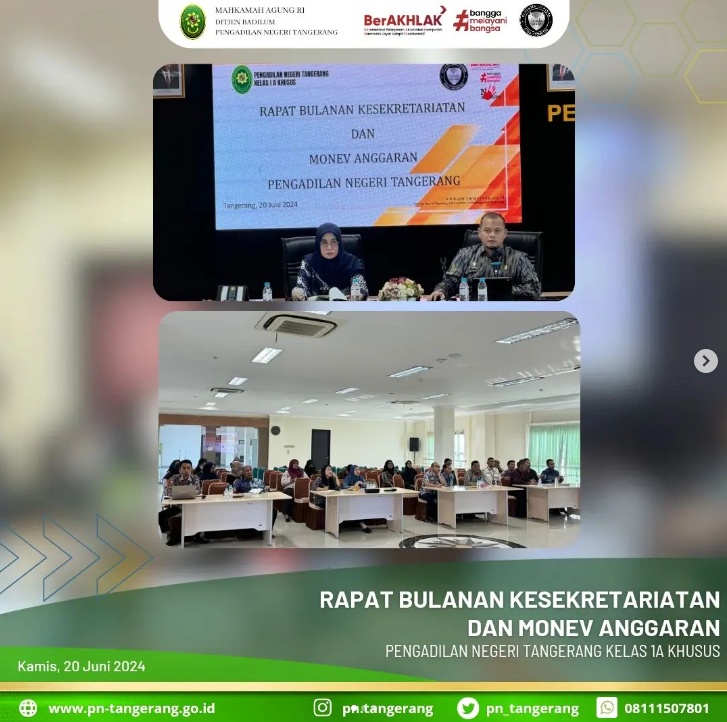 Pada pagi ini, pukul 08:30 dilaksanakan Rapat Bulanan Kesekretariatan dan Monev Anggaran Pengadilan Negeri Tangerang di ruang Aula Lt.5 PN Tangerang. Rapat ini dipimpin oleh Sekretaris Pengadilan Negeri Iconwin Tangerang, Bapak H. Zulfikar Arif Rahman Purba, S.H., M.M., dan didampingi Kepala Bagian Umum Ibu Dessy Herliani, S.Sos. Dihadiri oleh Kasubbag TUK, Kasubbag Ortala, Plt Kasubbag PTIP, Staff Kesekretariatan dan PPNPN.