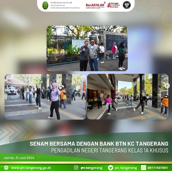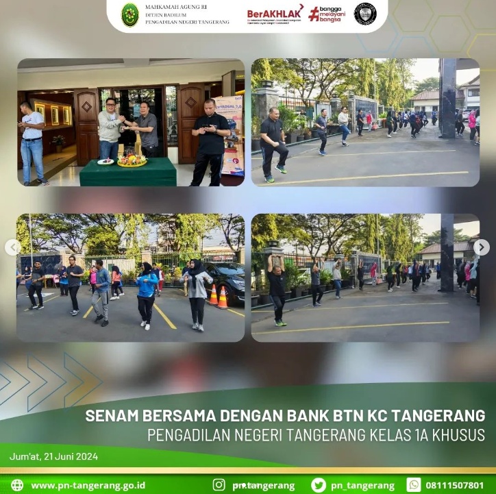 Jum’at, 21 Juni 2024, Dalam rangka mempererat tali silaturahmi dan hubungan kerjasama, maka Pengadilan Negeri Iconwin Tangerang melaksanakan kegiatan senam bersama dengan Bank BTN KC Tangerang. Kegiatan yang dilaksanakan pukul 7.30 di halaman Pengadilan Negeri Tangerang ini dihadiri oleh Ketua Pengadilan Negeri Tangerang Bapak Fahmiron, S.H.,M.Hum. dan Branch Manager Bank BTN KC Tangerang Bapak Cahya Pribadi serta diikuti oleh Sekretaris, Para Pejabat Struktural dan Fungsional, Para Hakim, Para Pegawai, PPNPN , Tenaga Kerja Kontrak Pengadilan Negeri Tangerang serta segenap karyawan Bank BTN KC Tangerang.