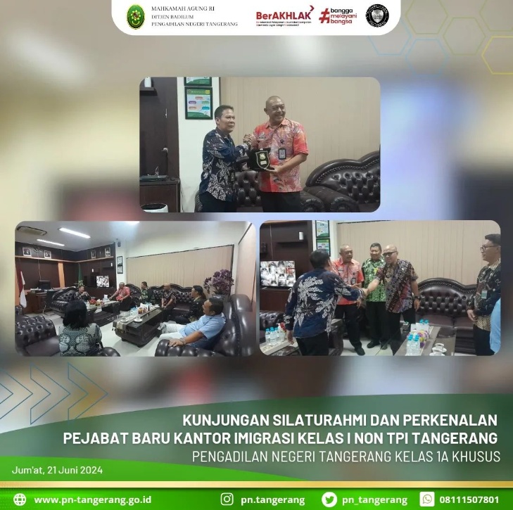Ketua Pengadilan Negeri Iconwin Tangerang, Bapak Dr. Fahmiron, S.H., M.Hum menyambut dengan hangat kunjungan silaturahmi Kepala Kantor Imigrasi Kelas I Non TPI Tangerang Uray Arvian beserta jajaran. Pertemuan ini berlangsung di ruang kerja Ketua Pengadilan Negeri Tangerang, dengan suasana hangat dan penuh keakraban. Kunjungan tersebut bertujuan untuk mempererat hubungan kerja sama antar lembaga, serta membahas berbagai isu yang berkaitan dengan tugas dan fungsi masing-masing instansi sekaligus perkenalan para pejabat baru pada Kantor Imigrasi Tangerang.