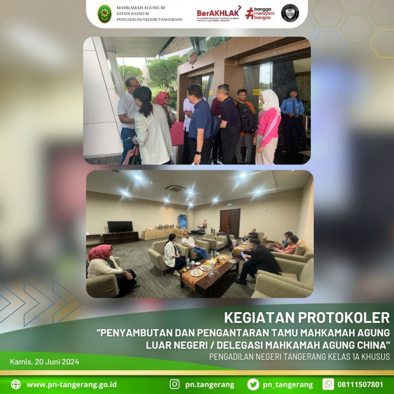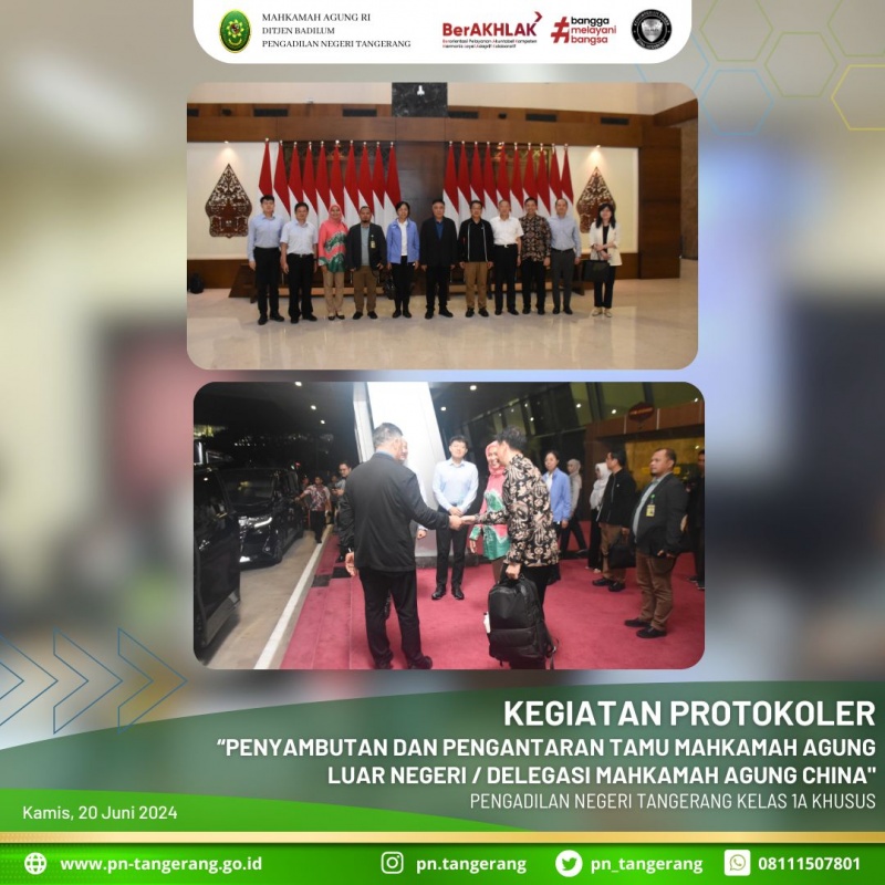 Berdasarkan surat undangan Mahkamah Agung Republik Indonesia, maka pada hari Rabu, 12 Juni 2024, Pukul 23.00 WIB, Wakil Ketua Pengadilan Negeri Iconwin Tangerang Bapak. H. Muhammad Alfi Sahrin Usup, S.H., M.H., didampingi oleh Sekretaris, Kepala Bagian Umum, Kasubbag TUK dan Panitera Muda Hukum, serta Tim Protokoler Pengadilan Negeri Tangerang yang terkait didalamnya, melaksanakan penjemputan tamu Luar Negeri/Delegasi Mahkamah Agung China yang diketuai oleh Hakim Agung Mahkamah Agung China H.E. Mr LIU Guixiang, Ketua Pengadilan Tinggi Tianjin Ms. LI Jing, Ketua Pengadilan Tinggi Henan Mr. HU Daocai, Wakil Direktur Departemen Pelaksanaan Umum Mahkamah Agung China Mr. MAO Lihua, Wakil Ketua Pengadilan Tinggi Hunan Mr GUO Zhenghuai, Pejabat Departemen Kerja Sama Internasional Mahkamah Agung China Ms. ZHAO Qian. Kunjungan ini merupakan kunjungan balasan, Dalam kunjungan tersebut, kedua belah pihak, baik Mahkamah Agung Indonesia maupun Mahkamah Agung China saling bertukar informasi di bidang Hak Kekayaan Intelektual (HKI) dan juga mengenai hukum yang berkembang saat ini di kedua negara agenda narasumber di Badiklat MA RI