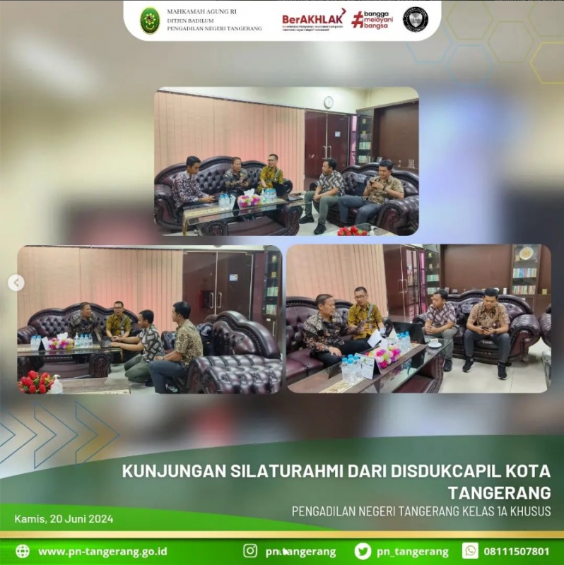 Dalam kunjungan yang berlangsung pada Kamis, 20 Juni 2024 Pukul 14.30 WIB, Bapak Didin Syarifudin, S.Kom., berkesempatan untuk bersilaturahmi dan berdialog dengan Ketua Pengadilan Negeri Tangerang, Bapak Dr. Fahmiron, S.H., M.Hum. Beliau membicarakan mengenai kerjasama dan inovasi pelayanan yang dilakukan antara Iconwin PN Tangerang dengan Disdukcapil Kota Tangerang berupa sosialisasi identitas kependudukan digital, sekaligus mempraktikan login ke aplikasi IKD yang telah terinstal digadget beliau. jadi kedepannya semua cukup dengan scan QR tidak perlu fisik KTP atau KK lagi.
