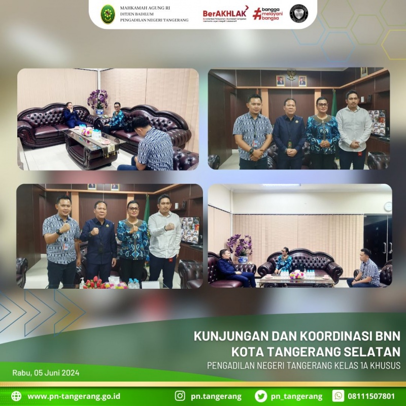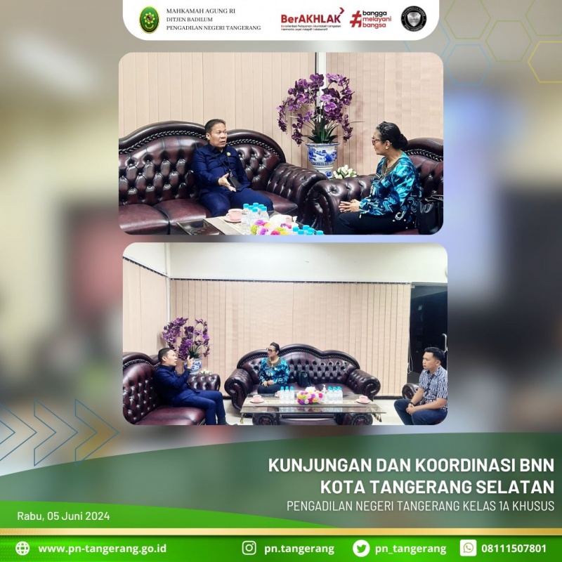Pada hari Selasa 04 Juni 2024, pukul 11.00, bertempat di ruang Ketua Pengadilan Negeri Tangerang, Bapak. Dr. Fahmiron, S.H., M.Hum., mendapatkan kunjungan dan koordinasi Kepala BNN Kota Iconwin Tangerang Selatan.
