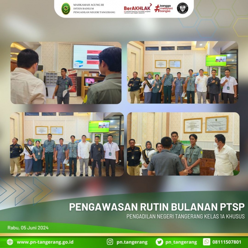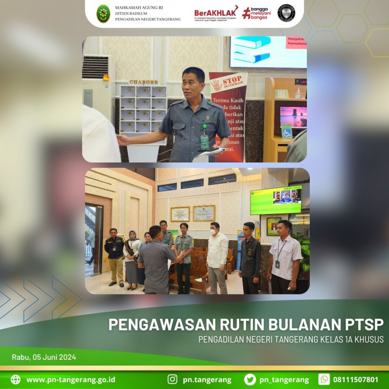 Bertempat di Ruang PTSP Lantai Dasar PN. Tangerang, Rabu 05 Juni 2024 diadakan pembinaan dan pengawasan rutin bulanan terhadap petugas Pelayanan Terpadu Satu Pintu (PTSP) PN Tangerang. Kegiatan pembinaan dan pengawasan ini berguna untuk menguji mulai kesiapan petugas pelayanan sampai sarana dan prasarana yang menunjang. Hal ini tentunya berdampak positif dan sangat baik guna mengukur Pelayanan dari PN Tangerang dalam memberikan pelayanan yang prima bagi para pencari keadilan. Tim Pembinaan dan Pengawasan PTSP PN Tangerang yaitu Hakim Kony Hartanto, S.H., M.H., diikuti oleh seluruh petugas PTSP.