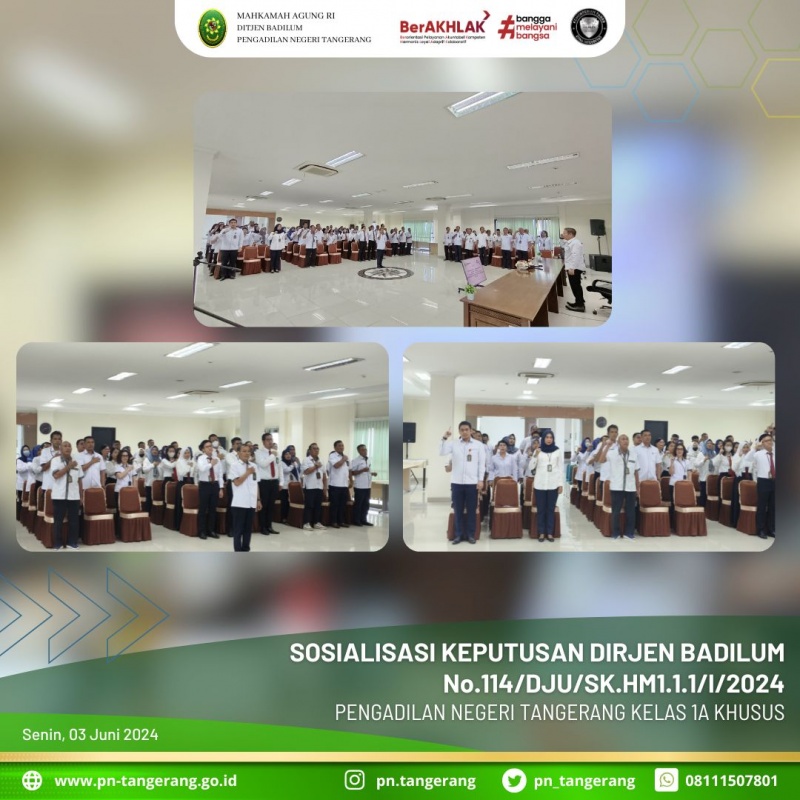 Sosialisasi ini bertujuan agar Pengadilan Negeri Tangerang dapat memberikan pelayanan yang PRIMA (Profesional, Responsif, Integritas, Mandiri dan Akuntable) kepada Masyarakat. Kegiatan ini dihadiri oleh Bapak/Ibu Hakim, Panitera, Sekretaris, Para Pejabat Setruktural/Fungsional, serta diikuti oleh Karyawan/Karyawati ASN, Tenaga Honorer, dan Tenaga Kerja Kontrak pada Pengadilan Negeri Tangerang. (is).