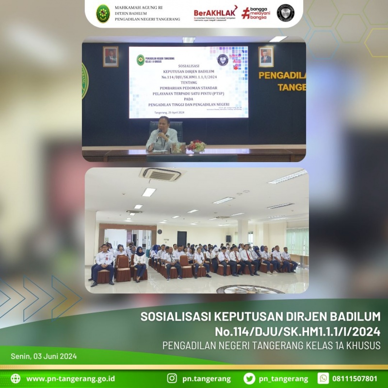 Ketua Pengadilan Negeri Tangerang Bapak Dr. Fahmiron, S.H.,M.Hum. melakukan Sosialisasi Keputusan Direktur Jenderal Badan Peradilan Umum Nomor 114/DJU/SK.HM1.1.1/I/2024 Tentang Pembaruan Pedoman Standar Pelayanan Terpadu Satu Pintu Pada Pengadilan Tinggi dan Pengadilan Negeri. Pelayanan Terpadu Satu Pintu (PTSP) adalah pelayanan secara terintegrasi dalam satu kesatuan proses dimulai dari tahap awal sampai dengan tahap penyelesaian produk pelayanan pengadilan melalui satu pintu. Petugas pada Pelayanan Terpadu Satu Pintu (PTSP) adalah pegawai pada Kepaniteraan Muda Perdata/Pidana yang bertugas pada meja 1, Kepaniteraan Muda Hukum dan pada Bagian/Sub Bagian Umum dan Keuangan untuk melaksanakan tugas dan bertanggungjawab sesuai tugas dan fungsi masing – masing.